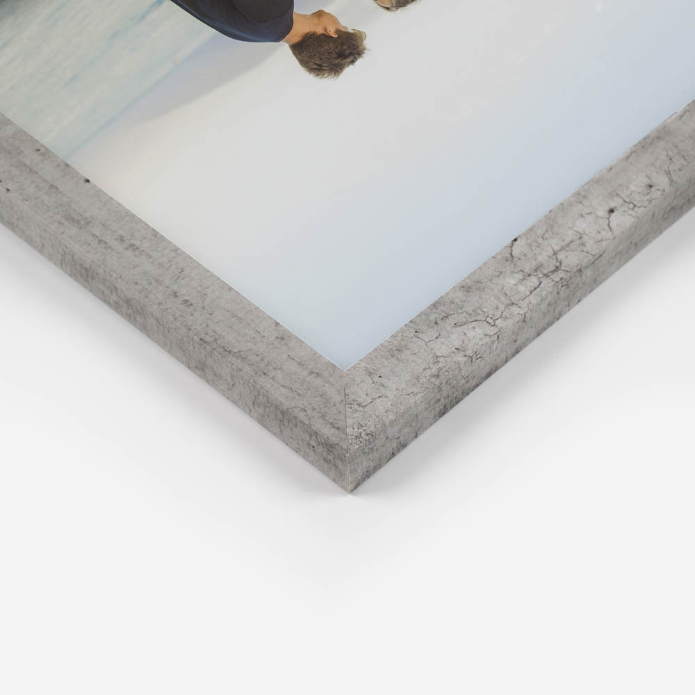 Moldura de alta qualidade, fabricada num material com aspeto concreto, garantindo durabilidade e um acabamento perfeito para destacar as tuas fotos.